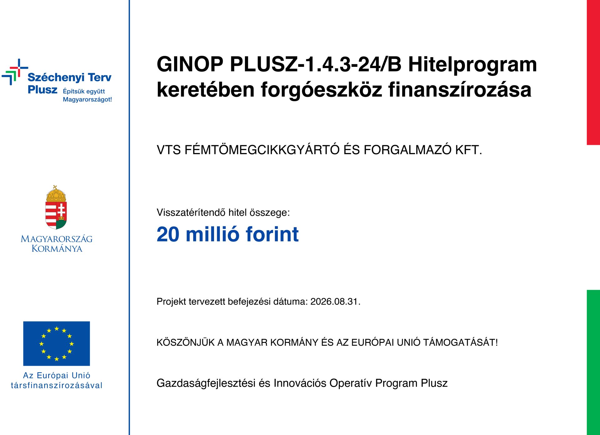 A Gazdaságfejlesztési és Innovációs Operatív Program keretén belül a Pénzügyminisztérium, mint Támogató által 2017. november 6-án meghirdetett „A KKV-k versenyképességének növelése adaptív technológiai innováció révén” című felhívása alapján, a VTS KFT támogatást nyújtott be.