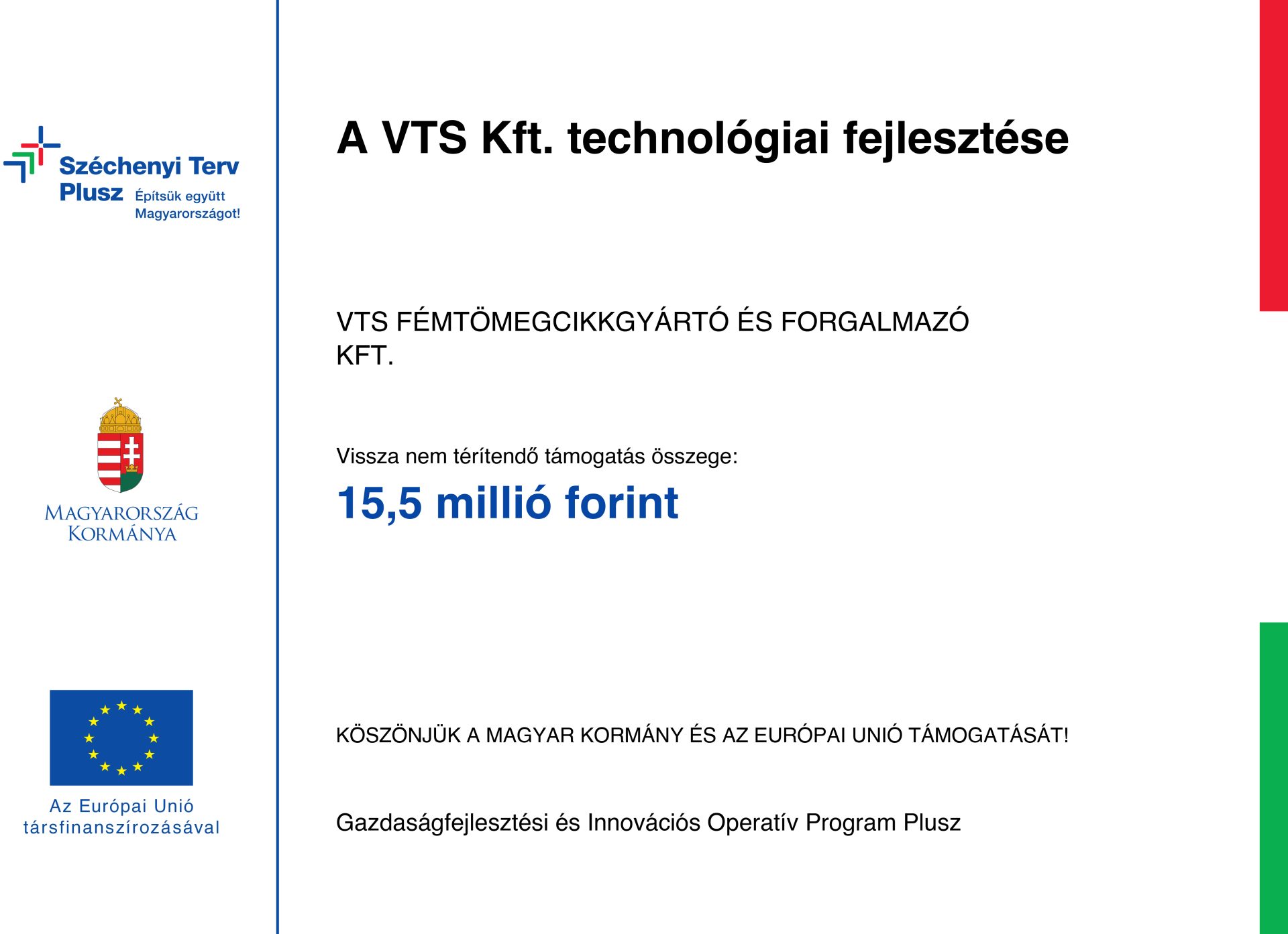 A GINOP_PLUSZ-1.2.4-25-2025-01029 azonosító számú, „A VTS Kft. technológiai fejlesztése” című projekt GINOP Plusz-1.2.4-25 kódszámú felhívás keretében, a Széchenyi Terv Plusz pályázati program finanszírozásában valósult meg. A Nemzeti Fejlesztési Központ, mint Támogató a VTS Kft.-t az Európai Regionális Fejlesztési Alapból és hazai központi költségvetési előirányzatból 15,5 millió forint összegű, vissza nem térítendő európai uniós támogatásban részesítette 2025.10.28-án. A projekt keretében technológiai fejlesztést eredményező új eszközök beszerzése, információs technológia-fejlesztés, ingatlanberuházás, valamint a projekt szakmai megvalósításának közvetett költségei kerültek elszámolásra.